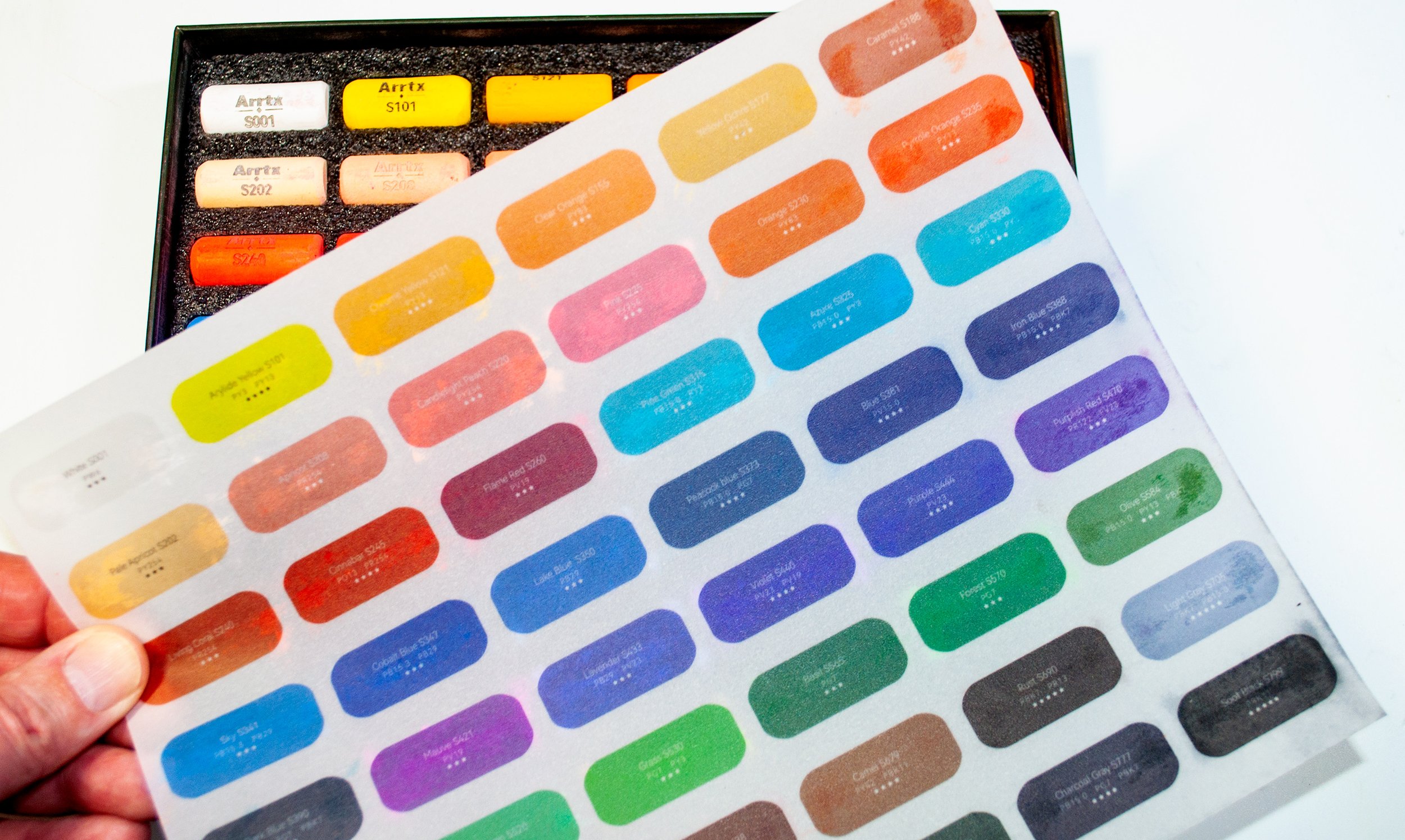 Before you feast your eyes upon the Arrtx Soft Pastels, you are presented with a swatch on paper similar to tracing paper, every color is on the sheet of paper along with information pertaining to each individual pastel. The first thing to note is the color name along with an alpha numerical number corresponding to the color name.