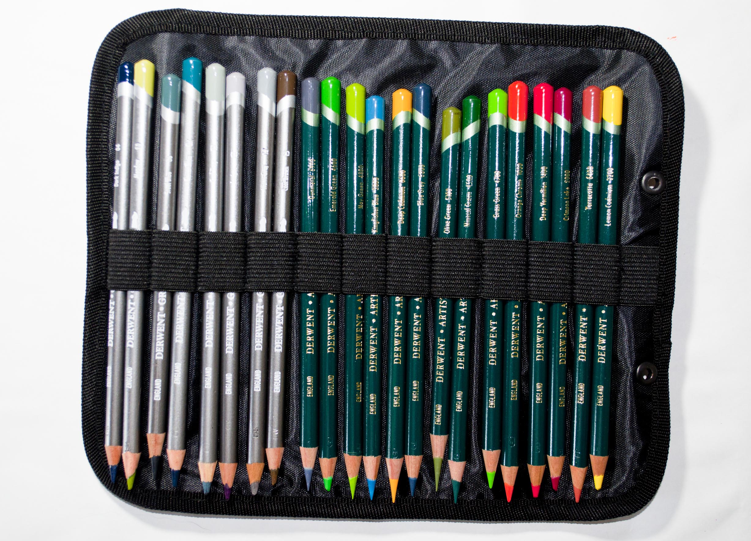 When you purchase the bag, inside you get three leaves, the leaves as Derwent call them, are canvas strips which clip into the bag and hold the pencils using individual elastic bands, with each band hold two pencils. The leaves are double sided and this allows for each individual leaf to hold comfortably, 44 pencils, 22 on each side.