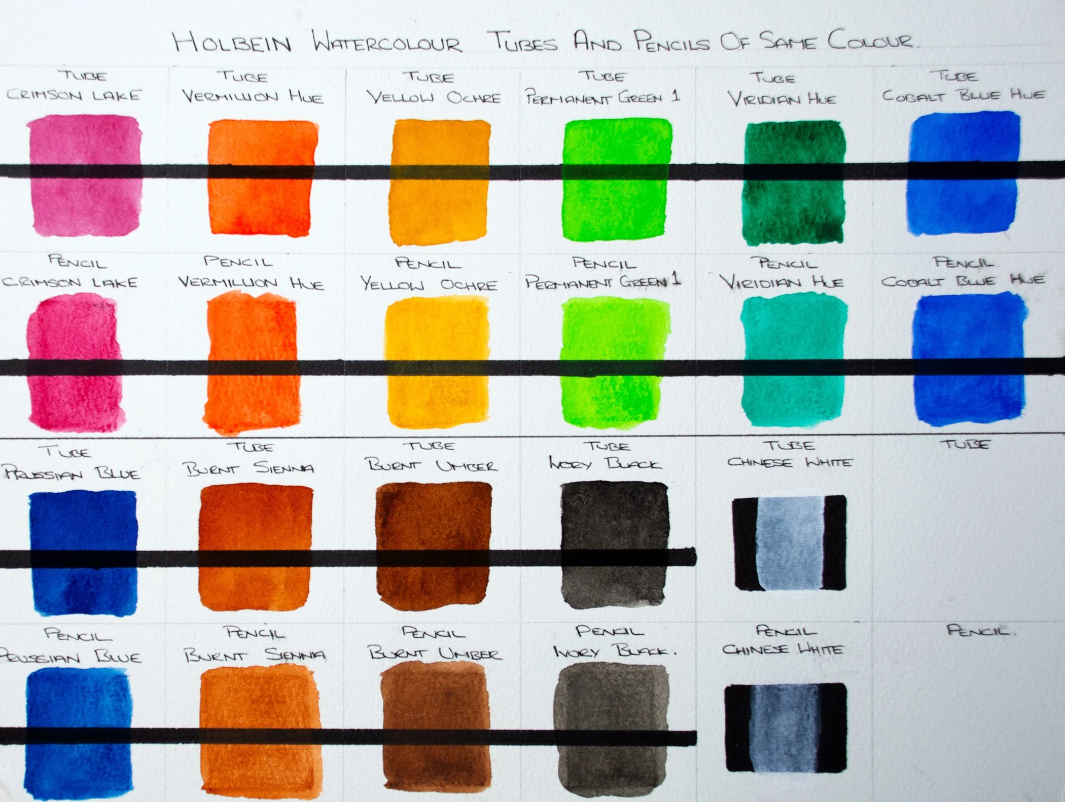 I included a black marker line through the test squares before applying the watercolors, although this was not necessary, as I completed the same test on the swatch, however I wanted to display if there was a difference in opacity between the Holbein tubes and pencils, which as you can see there wasn't .