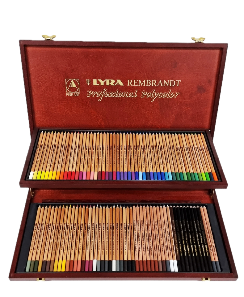 The Lyra Polycolor Colored Pencils are another pencil that in my opinion is severely overlooked when it comes to the colored pencil world. Very few artists use them in their projects which I understand regarding the lightfast ratings, but still find it such a shame given the overall quality of the Lyra Polycolor. This Wooden Box set from Lyra not only offers the full range of Polycolor Colored Pencils, 68 Assorted Colors, 10 Grey Polycolor Pencils, 5 Carbon Pencils, 3 Charcoal Pencils, 1 Carbon extra dark, 3 Water Soluble Graphite pencils, 1 craft knife, 1 sanding block, 2 blending stumps, 1 kneaded eraser, 1 sharpener and 8 assorted oil pastel pencils. All in all this is a beautiful set to own with a wonderful selection of pencils.