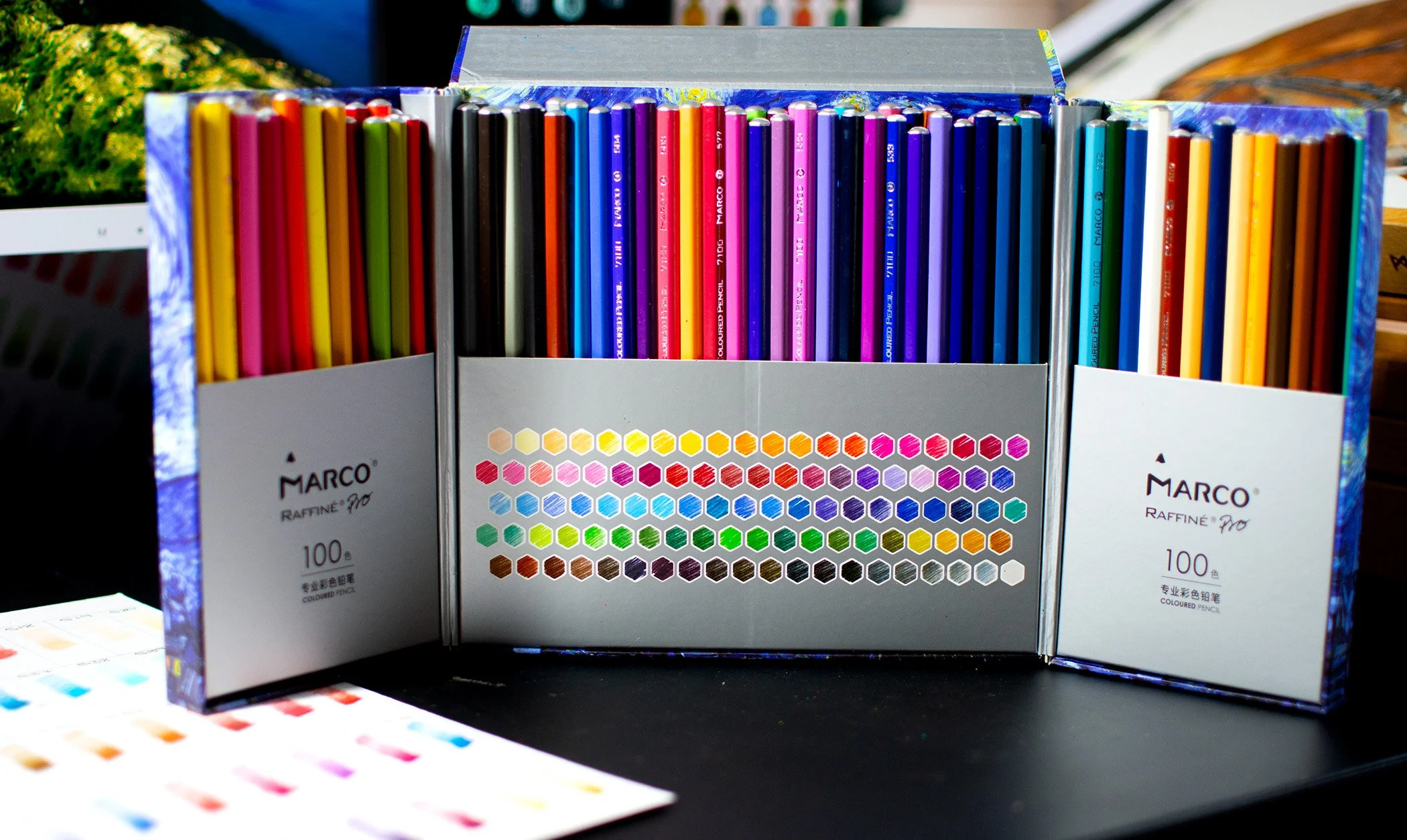 The package of this full 100 Marco Raffine Pro set opens with the simple release of the magnetic flap along the side, the full front of the box unfolds back on itself and from there, the box splits down the middle, presenting the full accompaniment of Marco Raffine Pro pencils.