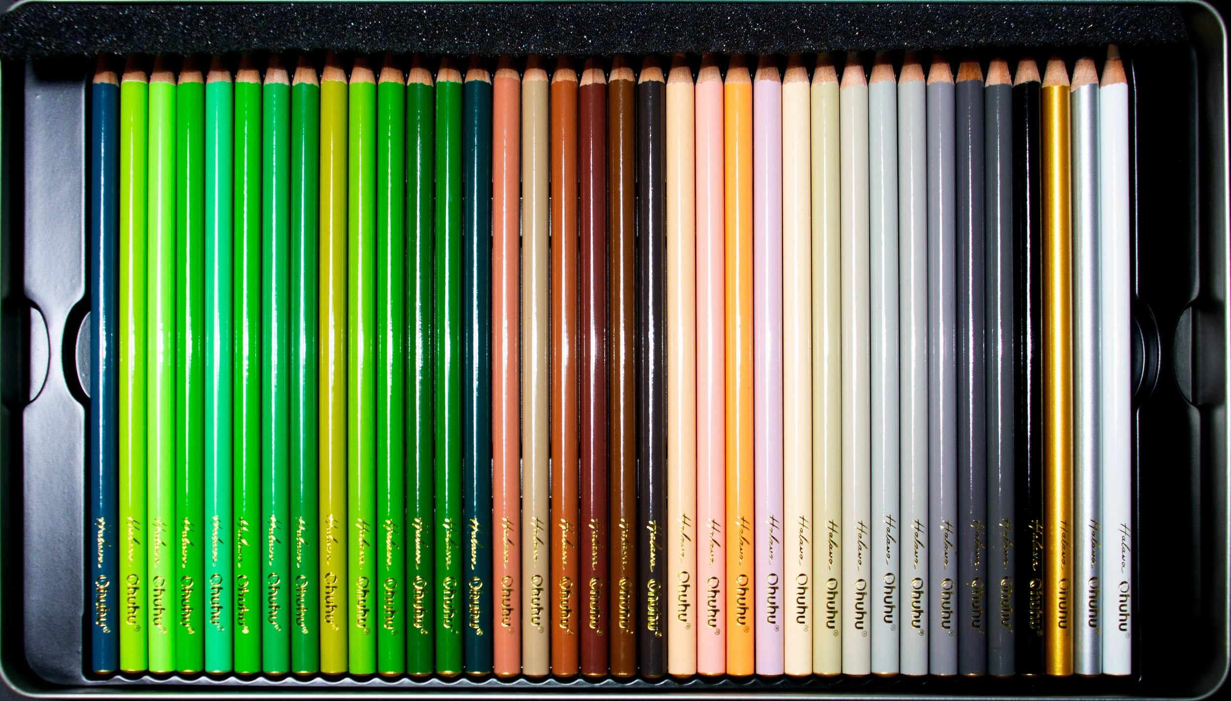 On opening the tin you are presented with two layers of colored pencils and as you can see from the images, the top tier starts with the yellows, oranges, reds, purples and into the blues. The bottom layer then merges from the blues, to the aqua blues and greens, the greens, earth tones, greys and finally a couple metallics, finishing off with a black and white. I will showcase the swatching of the colors further into the review.