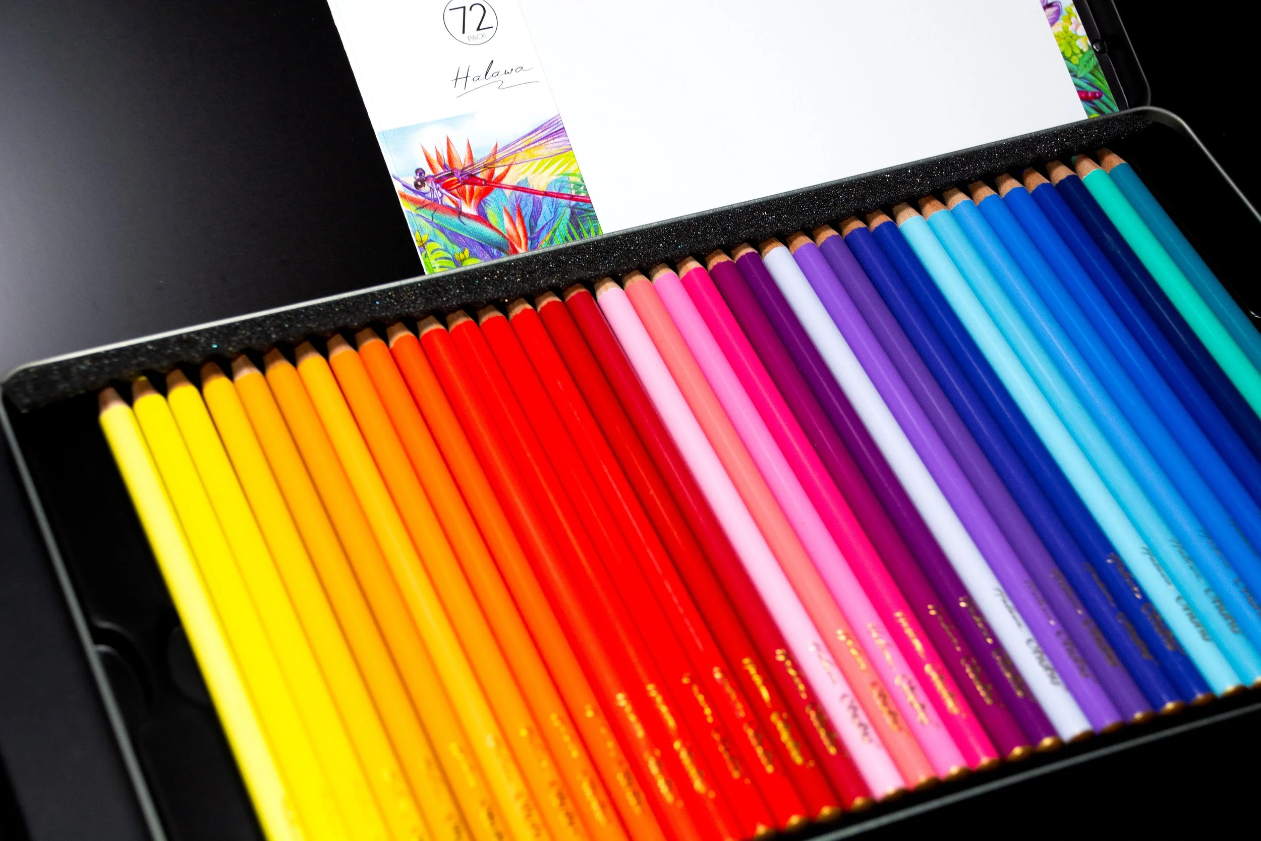 The 72 set of Ohuhu Colored Pencils on display for this review arrive in a black tin, with some bright and vibrant artwork on the front, depicting the bright and vibrant nature of the pencil cores. Also on the front of the tin there is information printed regarding the type of pencil inside the tin, information such as; Lightfast and Waterproof, Richly Saturated Pigments, soft and thick lead, Eco friendly natural basswood and easily blending and colouring for artists. On the back of the tin there is a laser printed swatch, just to give the potential buyer a visual idea of the colors present in the set.