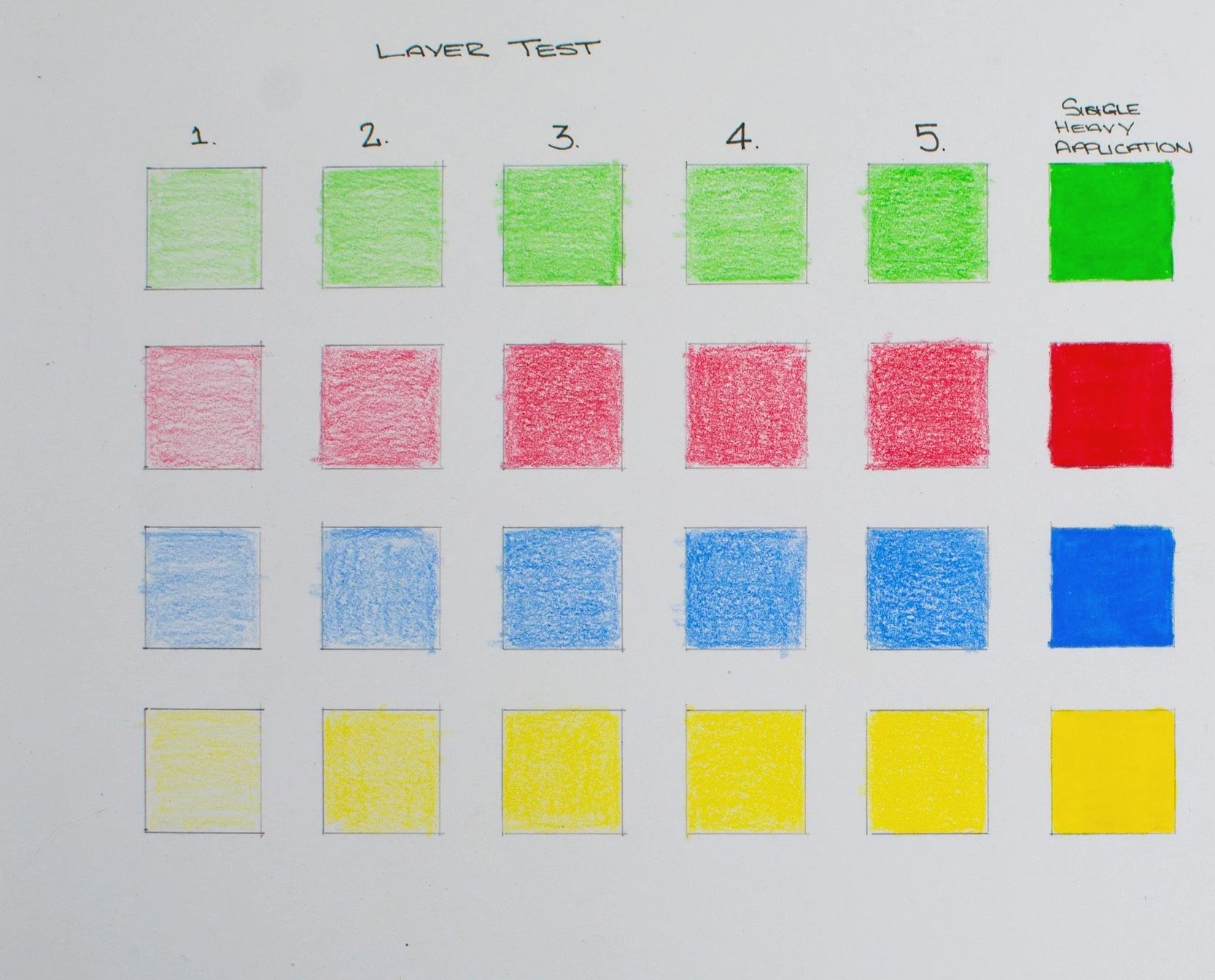 I started out on the Strathmore 300 Series Bristol Velum paper with the layering test, this is where I complete six columns with four different colors. Each column I apply an incredibly light layer, holding the pencil toward the end of the barrel and allowing the weight of the pencil to layer. Layer 1 has a single light layer, column 2 has a two light layers all the way up to the fifth column. The final column displays a single heavy application showcasing the pure saturation levels of the pencils.