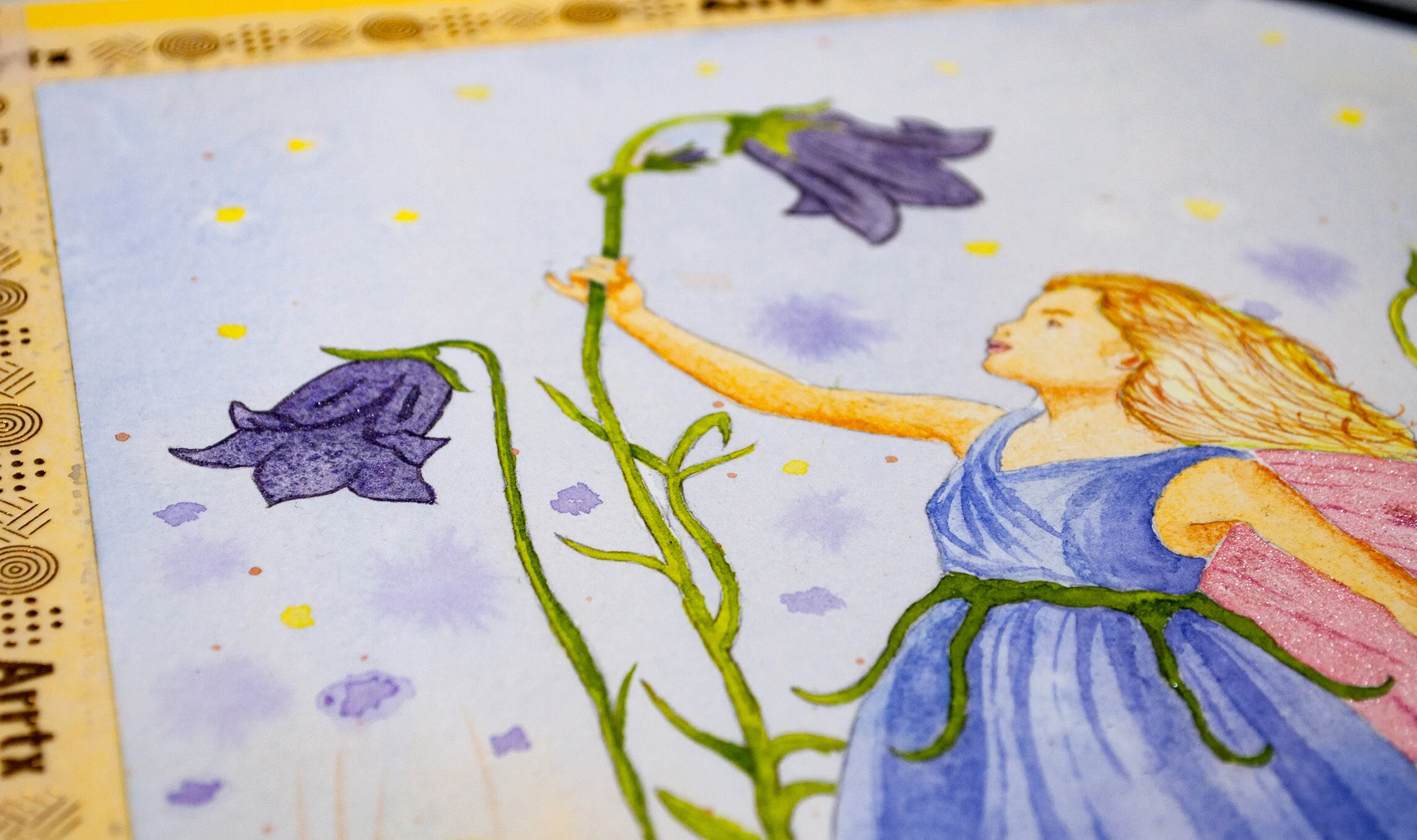 I had to mix colors to give me the flesh of the Fairy and the same with the greens to give me a good variation. When it came to the wings I used the Pearlescent Pauls Ruben Watercolors and as soon as the Pink hit the paper the glitter and sheen was instantly noticeable and created a very effective appearance.